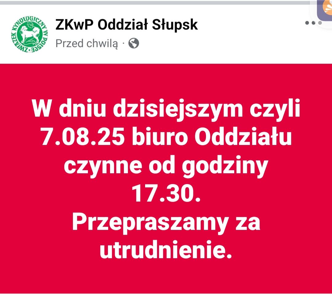 W dniu dzisiejszym czyli 7.08.2025 biuro Oddziału będzie czynne od godziny 17.30.